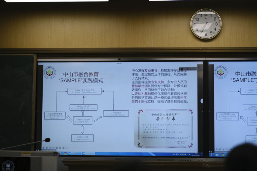 林开仪还介绍了中山市融合教育“SAMPLE”模式。“SAMPLE”模式是以特校为支撑(S)、以巡回指导为支持(A)、以多专业人员为团队(M)、以学生个别化支持为目标(P)、以特教中心为主导(L)、以评估为基础(E)的融合教育实践模式。在这一模式中,特教中心发挥专业主导、特校发挥专业支撑作用,奠定模式运作的基础,完善支持体系;巡回指导提供专业支持,多专业人员对普特融合团队提供专业保障,让模式有效运作,健全融合机制:以评估为基础提供优质融合教育教学服务的教学实践让本模式最终落脚于学生的个别化支持,提高了融合教育质量。