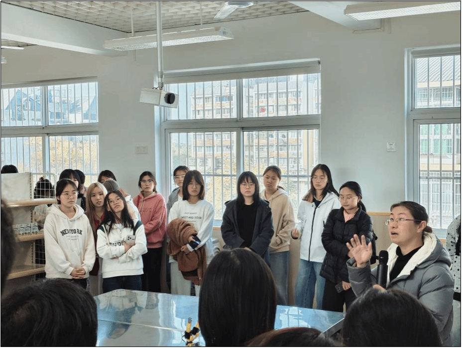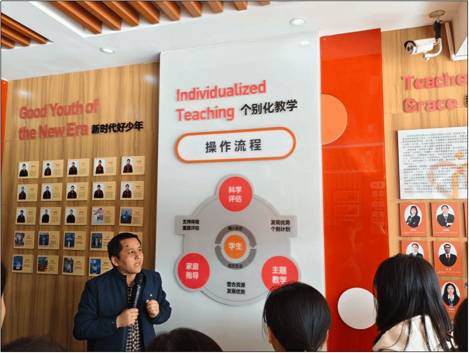 随后,在张晓雯老师引导下,同学们实地参观校园。五楼职业教育实训区亮点突出,作为“十四五”特教提升计划成果,学校2018年经区政府批准设立中职部,开设物业服务、中餐烹饪两大专业,推动学子从“庇护式就业”向“支持性就业”转型。同时学校紧跟时代步伐,引进的VR虚拟实训设备以及智能物业服务机器人。同时,展销编织室、香料种植园等为学生构建起多元实践平台。此外,从五楼的模拟银行、四楼快递收发模拟区再到三楼高铁地铁进站与售票模拟场景,学校最大化利用空间资源,将生活技能与职业训练深度融合,让特殊学子在沉浸式体验中提升社会适应能力,直观展现了“点·立教育”模式的实践魅力。