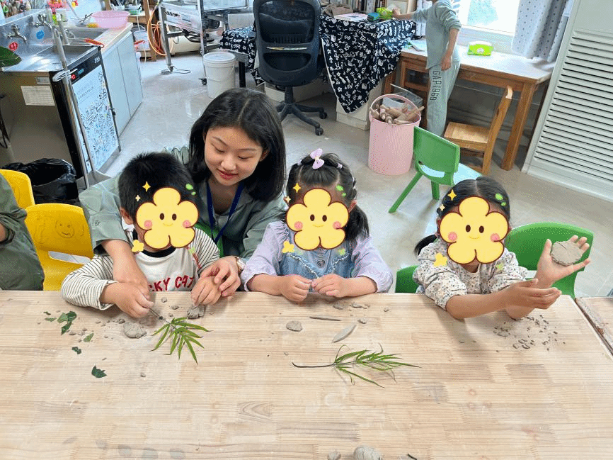 在二楼的陶艺馆里,泥巴的湿润触感与孩子们的笑声交织出独特的韵律。作为观察者,实习生们惊喜地发现:当小手搓出歪扭的线条时,童真远比完美更动人;当混龄伙伴共同制作泥板字时,协作已然在指尖自然发生。陶艺课堂让实习生们重新理解”教育即生长”的内涵——教师需要做的不是纠正每道不规则的纹路,而是守护这份原始的生命力。看着孩子们将天马行空的想象注入陶土,杜威先生所说的“真实的成长正萌发于这样的创造瞬间”也逐渐浮现在实习生的脑海中。
