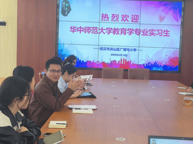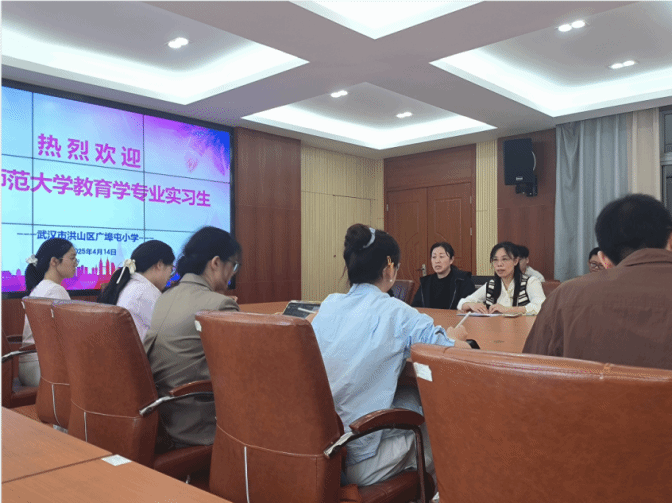师生对接当天,即4月14日下午,华中师范大学教育学院本科生教育实习广埠屯小学队启动仪式在广埠屯小学3楼会议室举行。广埠屯小学校长舒畅、7位实习指导教师、教育学院程豪博士、2022级教育学专业13名本科生以及2023级课程与教育论专业1名研究生参与了实习启动仪式。