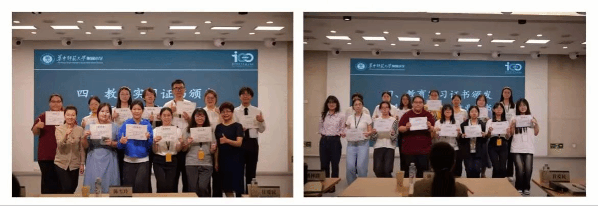 紧接着,会议进入了教育实习证书颁发环节。由华师附小副校长甘爱民、教育学院党委书记陈雪玲与带队教师孙银光共同为实习生们颁发了结业证书,并对表现突出的优秀实习生进行了表彰,颁发了荣誉证书。