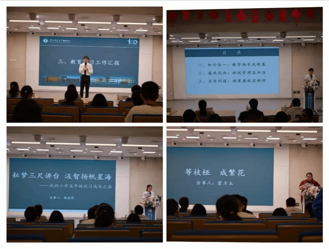 在教育实习工作汇报环节,团队实习工作总结由杜涵超同学以《躬耕杏坛育新苗 春生夏长映初心》为题进行汇报。她详细总结了实习期间团队的工作成果与经验教训。个人实习工作感言部分,陈欣然同学以《耘梦三尺讲台 汲智扬帆星海》为题,分享了她在实习过程中的感悟与收获;霍方玉同学则以《等枝桠 成繁花》为题,讲述了自己在教育道路上不断进步、实现自我提升的过程。