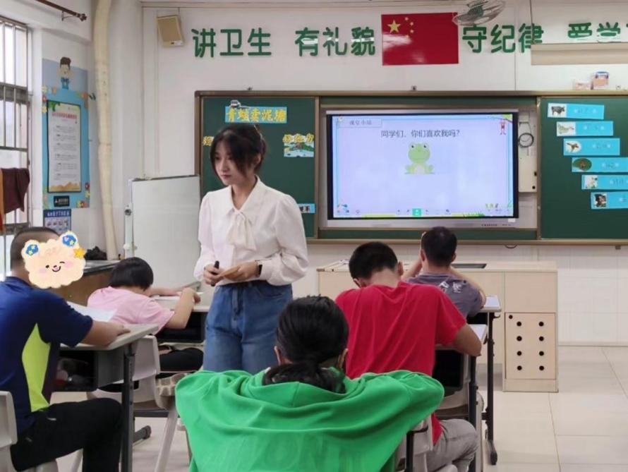 刚到这个班,我遇到了不少的困难。一个陌生人的突然加入,好像打破了这个班级的秩序,我有一点失落。可是在后来一起吃饭、接送孩子们、带班上课的日子里我越来越觉得,遇到这些孩子很偶然也很惊喜,或许你能体会拥有整片星空的感受嘛?这些孩子就是我的星星,他们闪着不一样的光芒。在这之前我与特殊孩子相处时间最长的一次是2022年的暑期社会实践,那时我写下“我始终相信,世界先爱了我,我不能不爱他。孩子们是会持续给到我们爱的回应的。”丰富的表情、夸张的动作和有趣的谈话,在用心去爱他们的过程中,被信任、被依赖、被纯真包围的感觉真的很好。课堂之外班级管理的工作也让我学到了更多书本上没有的知识,有意识做好问题预案,这是他们带给我的一份现实经验。于是我说,“我的底色是希望,是期待,是与他们一同成长”。