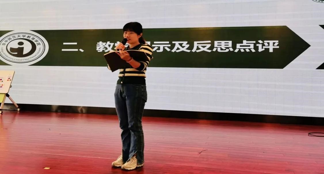 在实习感悟分享环节,混龄班实习生代表付甜甜向参会人员分享了她在实习过程中的收获。她认为相信儿童快乐成长、多样课程全面发展、虚心请教不断成长等方面对于学前专业实习生来说非常重要。观看实习vlog时,全体师生共同回顾了实习路上每天都在发生的美好与快乐。