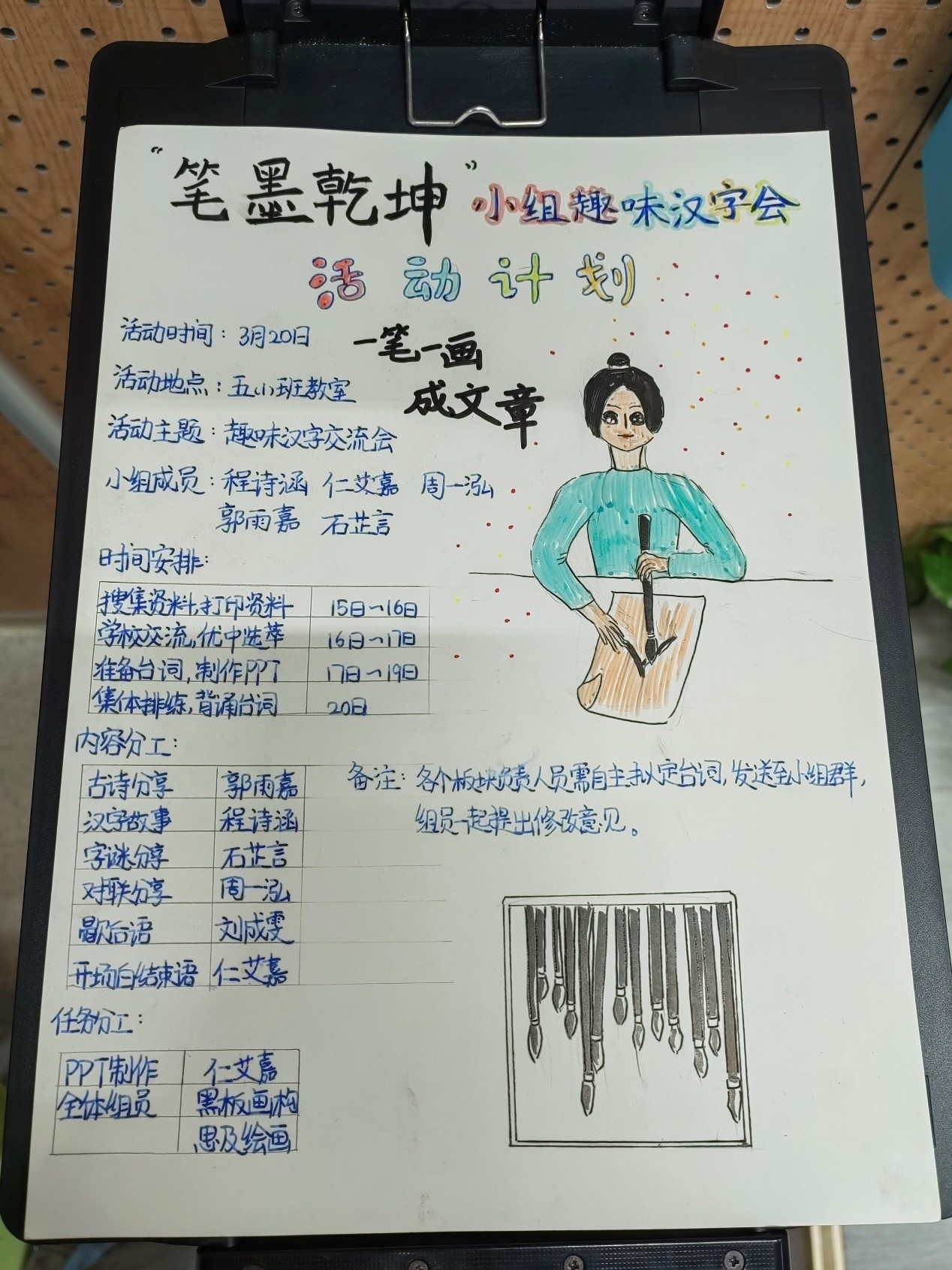 每次我在批改同学们作业的时候,我都可以清楚地看到44名同学的基础知识掌握情况,也会根据自己做学生的经历联想到学生每天写课堂作业时的心情。语文基础知识的掌握,往往需要一定量的重复,但是重复又不是语文学科的全部;语文素养往往都是在学生自主创造的过程中展现出来的。实际上,我发现与重复的抄写任务、有固定答案的课堂作业任务相比,我们班的学生也更加倾向于创造性任务,更喜欢人与人之间建立“链接”的感受。卞老师为我做了一个很好的示范。她会利用课本每单元末尾的语文园地活动布置让学生自由分组和写小组学习任务单的要求,之后在课上统一评讲任务单的分工、编写等注意事项。卞老师和同学们约定好在1-2周之后专门划出课堂时间用表现性评价的方法验收小组学习的成果,让同学们做小组展示。同时,她也会帮助学生总结任务学习的收获。
