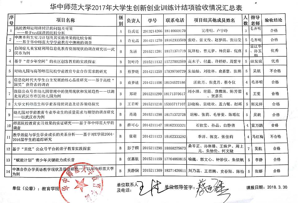 2017年,教育学院共有14个科研团队成功立项,覆盖全院各个年级各个专业,学生科研热情高涨,参与学生共有68人,占全院本科生总人数10.1%;项目指导老师共有15人,其中正高职称4人,副高职称9人,讲师职称2人,起到了良好的科研指导和引领作用。