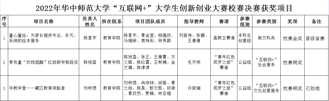 本科教学办公室讯(通讯员 周琰)日前,本科生院公布了《2022年华中师范大学“互联网+”大学生创新创业大赛校赛决赛获奖项目》名单,我院三个项目获奖。