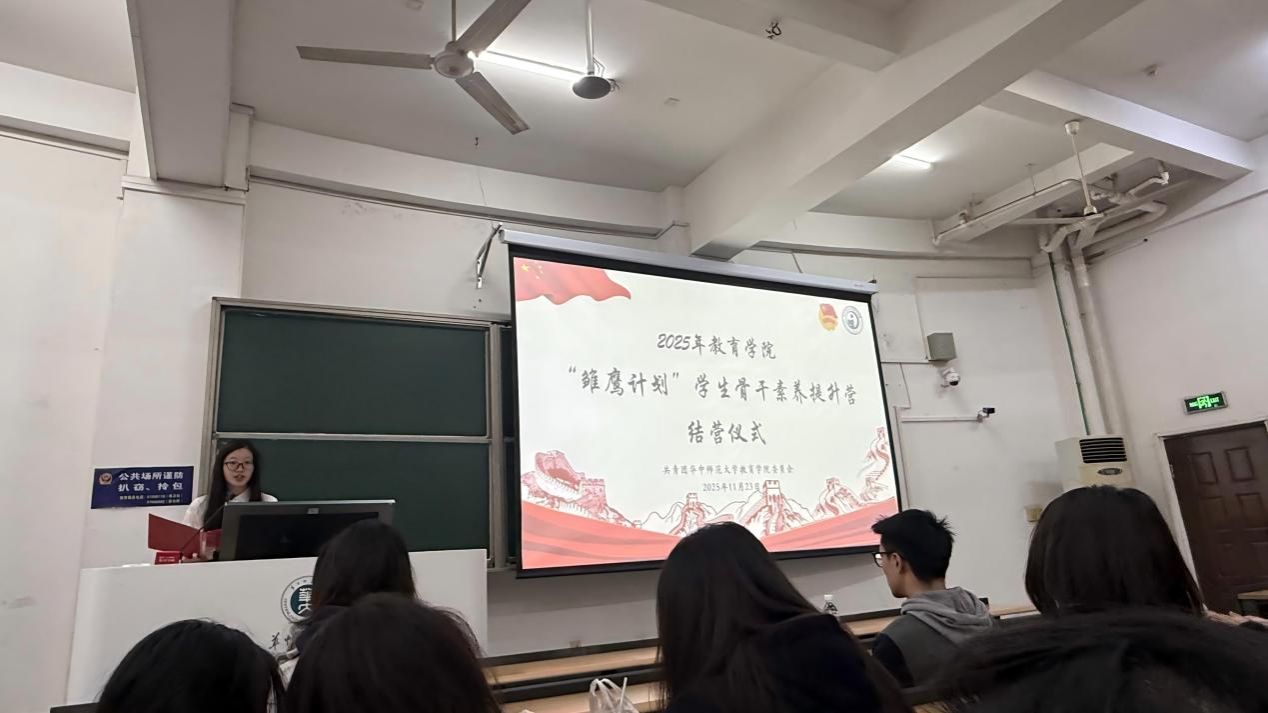 教育学院融媒体中心讯(通讯员 诸家驹 勾良爽)11月23日上午,教育学院2025年“雏鹰计划”学生骨干素养提升营在九号楼9-11教室结营。在为期十天的集中培训中,全体营员以饱满的热情和昂扬的斗志,积极投入各项课程与实践活动,在学、思、践、悟中锤炼意志,在知行合一中提升能力,充分展现了教育学院学子的蓬勃朝气与责任担当。