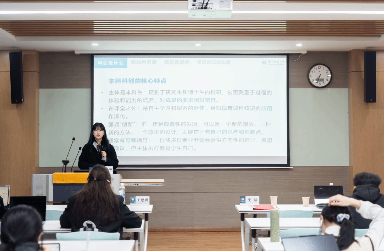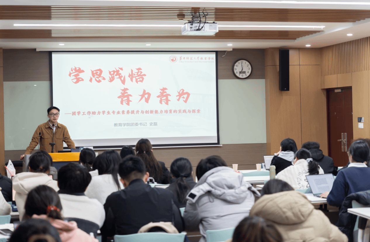 史磊以“学思践悟,青力青为”为主题,详细介绍了学院在科创育人方面的具体举措:师范技能见面会覆盖全体新生;启悦读书会推荐专业经典;科创比赛孵化多项科创项目;暑期社会实践供学生积累丰富经验。此外,史磊还阐释了团学工作与科创育人之间的内在联系,以扎实的成果展现了学院育人路径的有效性,为青年学生的科创成长指明了方向。