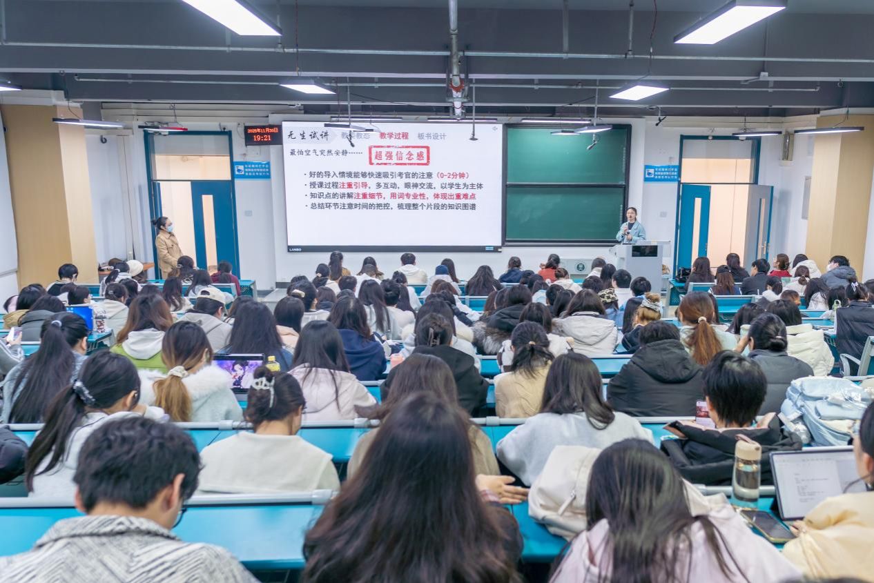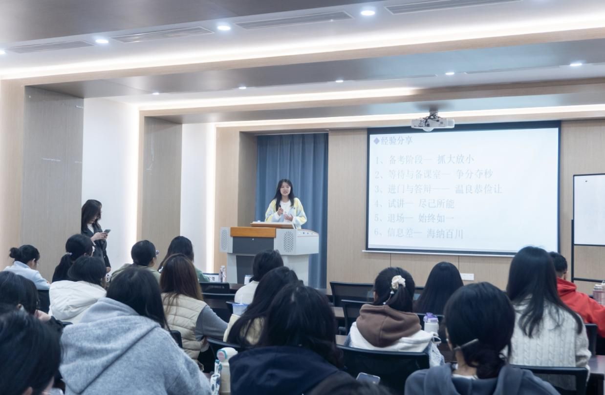与此同时,在8号教学楼8310教室,一场面向教育学院学生的专场讲座同步开展。化学学院2022级公费师范生邓艳林担任主讲,她结合自身面试经历,系统讲解了从考前准备到答辩结束的全过程注意事项。邓艳林从证件携带、着装礼仪等细节入手,逐步深入到抽题备考、教案撰写、试讲呈现以及结构化问答与答辩的策略方法,并现场分享了曾抽到的真实题目及备考思路。她的讲解细致实用、贴近实战,帮助同学们对面试流程形成了清晰认识,获得了在场学生的一致好评。