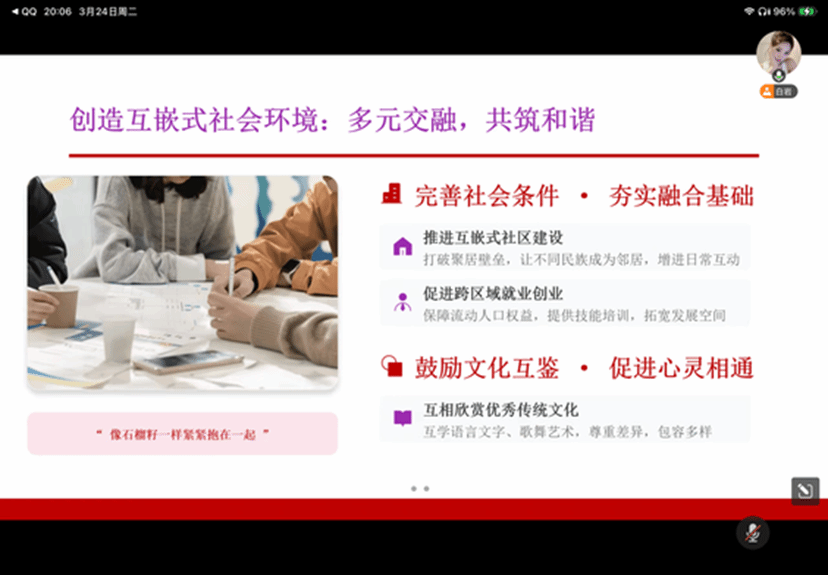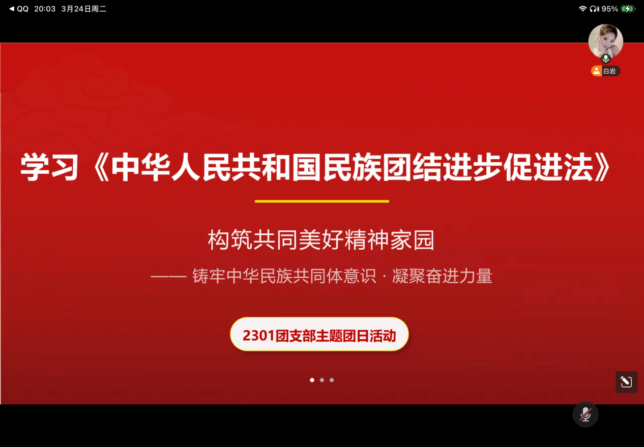 教育学院融媒体中心讯(通讯员 魏银莉)为深入学习《中华人民共和国民族团结进步促进法》,引导青年学子铸牢中华民族共同体意识,3月24日晚8点,2301团支部在线上开展了“学习《中华人民共和国民族团结进步促进法》,构筑共同美好精神家园”主题团日活动。本次活动由2301班团支书白岩主持,2301班全体支部成员齐聚云端,共同学习、交流探讨新时代青年在维护民族团结中的责任与担当。