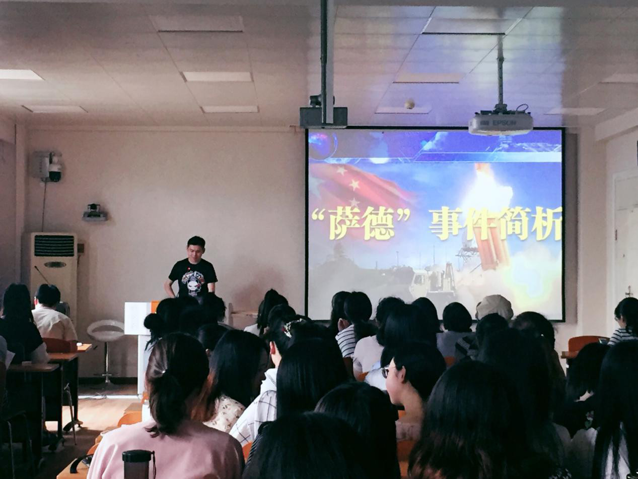 接着苗欣同学就“萨德事件”为学生们做了简析,分别讲到了萨德事件脉络、研制背景、萨德系统用途及其影响,着重讲了萨德导弹防御系统的部署将会对中国的影响,他提到:“美国在韩国部署萨德之后,中国有相当一部分的地区都在该雷达的探测范围之内,这对中国是非常不利的”。同时苗欣也提醒同学们心中要有大国情怀,理性爱国,保持清醒理智的头脑。此次分享增强了同学们对萨德系统的认识和了解,同时也进一步提高了同学们的爱国意识,至此,本次活动顺利结束。