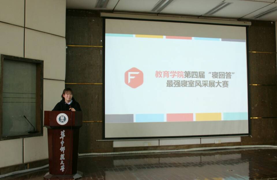 教育学院宣传中心讯(记者:邹净植 编辑:张萌)2018年4月14日星期六上午,为了给广大学子提供展示寝室文化、增进交流、凝聚团队意识的平台,华中师范大学2018“和谐寝室魅力风采展”暨教育学院第四届“寝回答”最强寝室初赛于九号楼一楼报告厅举行。本场赛事共计三支队伍入围,邀请了教育学院团委学生会生活部副部长韩茹月、16级生活部部长修钰颖及1701班生活委员何雅心作为评委。