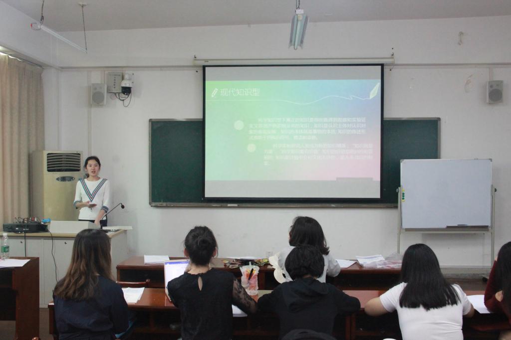 分享活动正式开始,展示的小组分别从本书的不同章节出发,结合书外的拓展内容进行分享,其间还夹杂着自己对现实的深刻思考。第一小组的林晨、蔡亚男等三位同学给大家讲解了历史上发生的三次知识转型,通过他们的讲述,同学们了解到原始知识、古代知识、现代知识以及后现代知识四者的纵向历史联系。