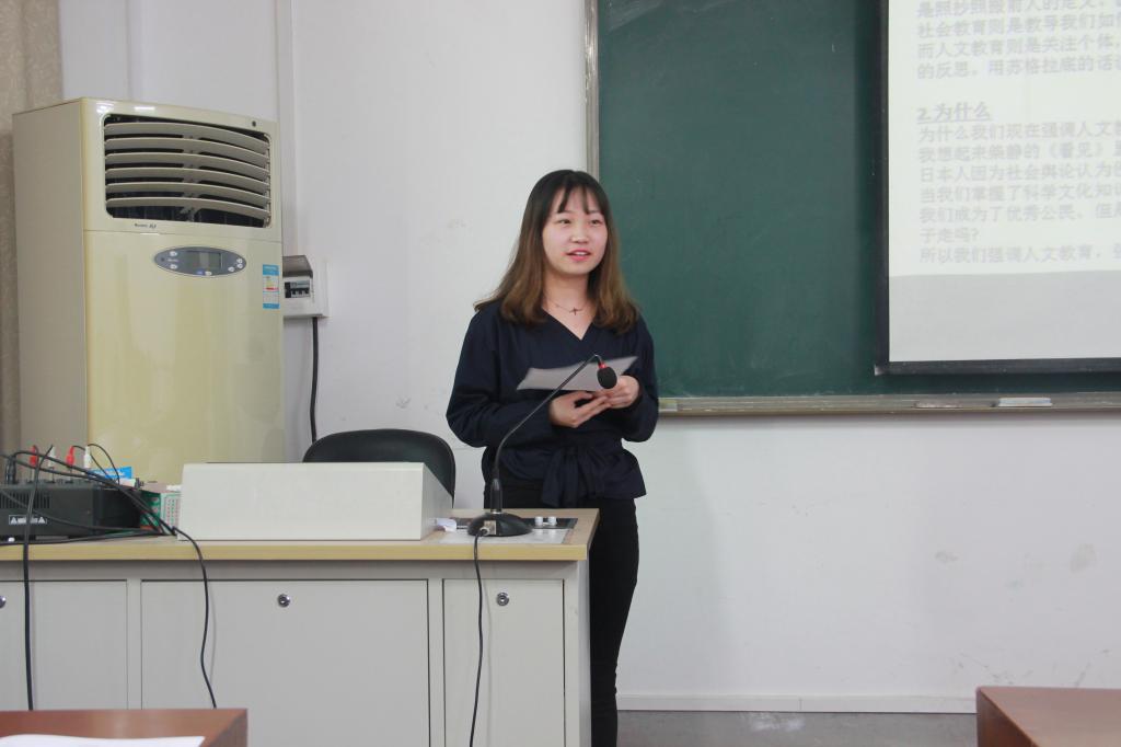 “人文教育”一词在本次读书分享活动上成为了讨论的热词,第七小组的戴钰评议结合,就此话题提出了许多深刻见解。首先,她阐述了自然世界、社会世界以及人文世界的划分依据——事实、价值和意义,并以此为立论依据,介绍了与三大世界相对应的知识类型和教育类型。“子曰:‘古之学者为己,今之学者为人’,这里的‘己’指的是探索人生的价值和意义,而这也正是人文教育所要引导的方向。”提到人文教育的意义时,她说道。