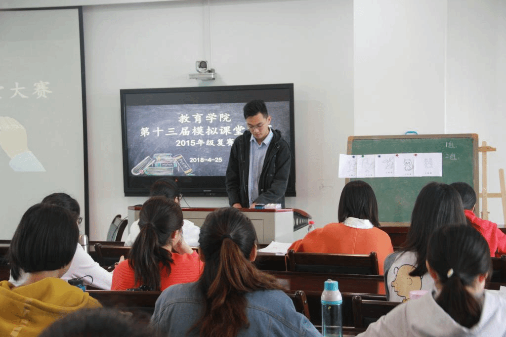 教育学院2015级宣传部讯(通讯员:阮班松 张子涵 编辑:张萌)4月25日中午12点半,教育学院第十三届模拟课堂大赛2015级复赛于田家炳601教室顺利举行。本次比赛邀请到专业教师张娜、王鶄、辅导员王诗薇及12名学生代表担任评委。本次参赛的12名选手由班级推选产生。