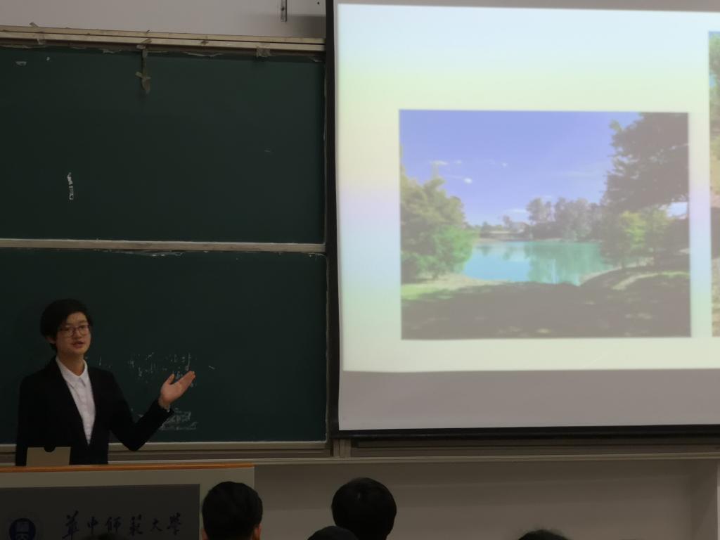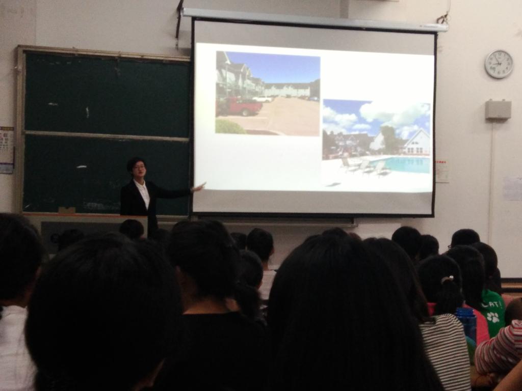 首先,彭博简要介绍了学校的外部景色以及内部的硬件设施。她介绍道:“佐治亚南方大学环境优美,设施齐全,除了独立的住宿以外,还设有厨房、洗衣房、健身场所等。”此外,彭博还向同学们介绍了学校的校徽。