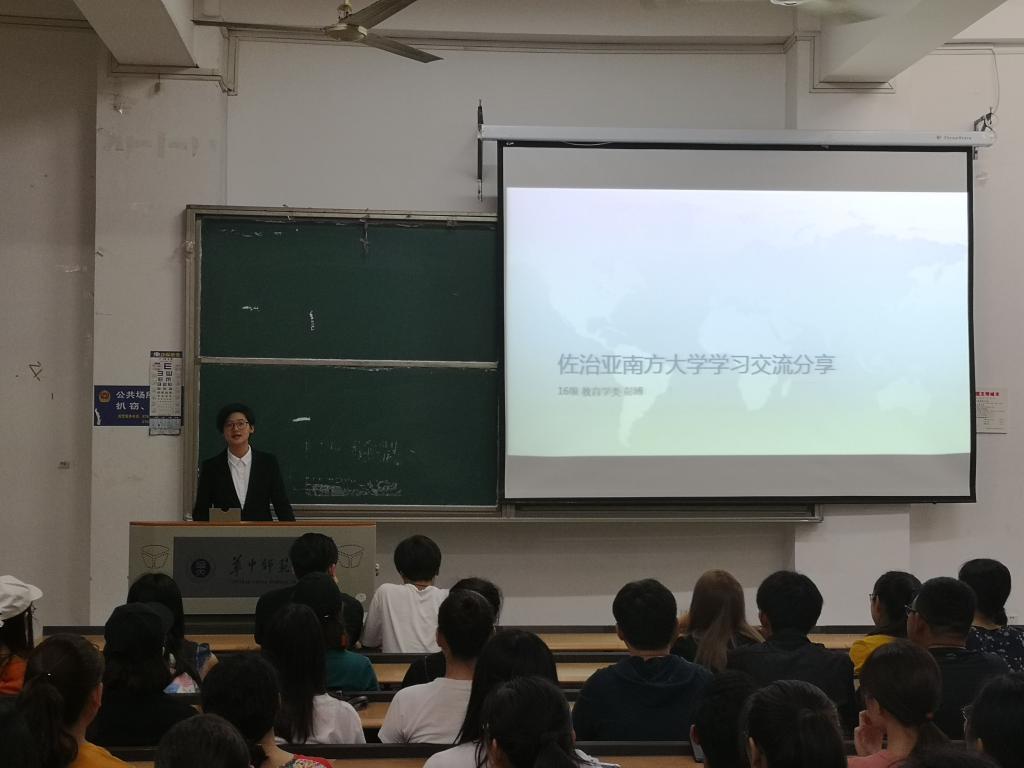 教育学院宣传中心讯(通讯员 刁柳君 杜喜调 编辑 季崇楚)5月13日晚,教育学院2016级全体同学在9301教室举办2018年佐治亚南方大学学习交流经验分享活动。刚从美国交换回国的2016级学生彭博为在场全体同学做了相关分享,本次活动由2016级辅导员王倩倩主持。