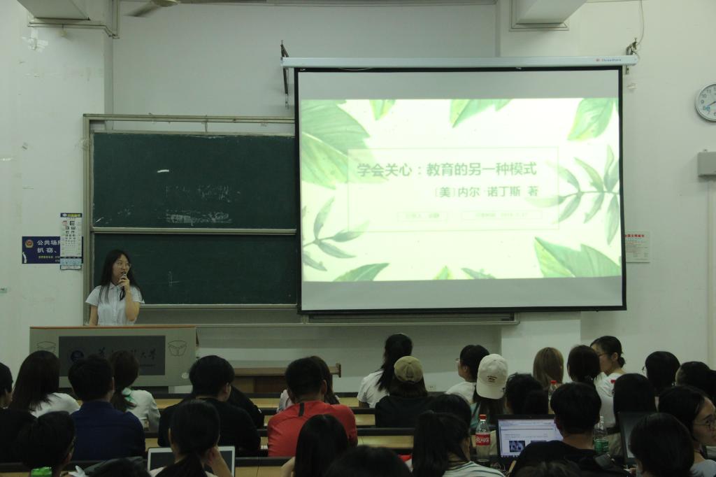 活动伊始,胡静同学对《学会关心——教育的另一种模式》一书进行了简要介绍。她的介绍围绕作者简介、写作背景、以及行文介绍展开,最后以其对所读内容的思考与感悟结束。