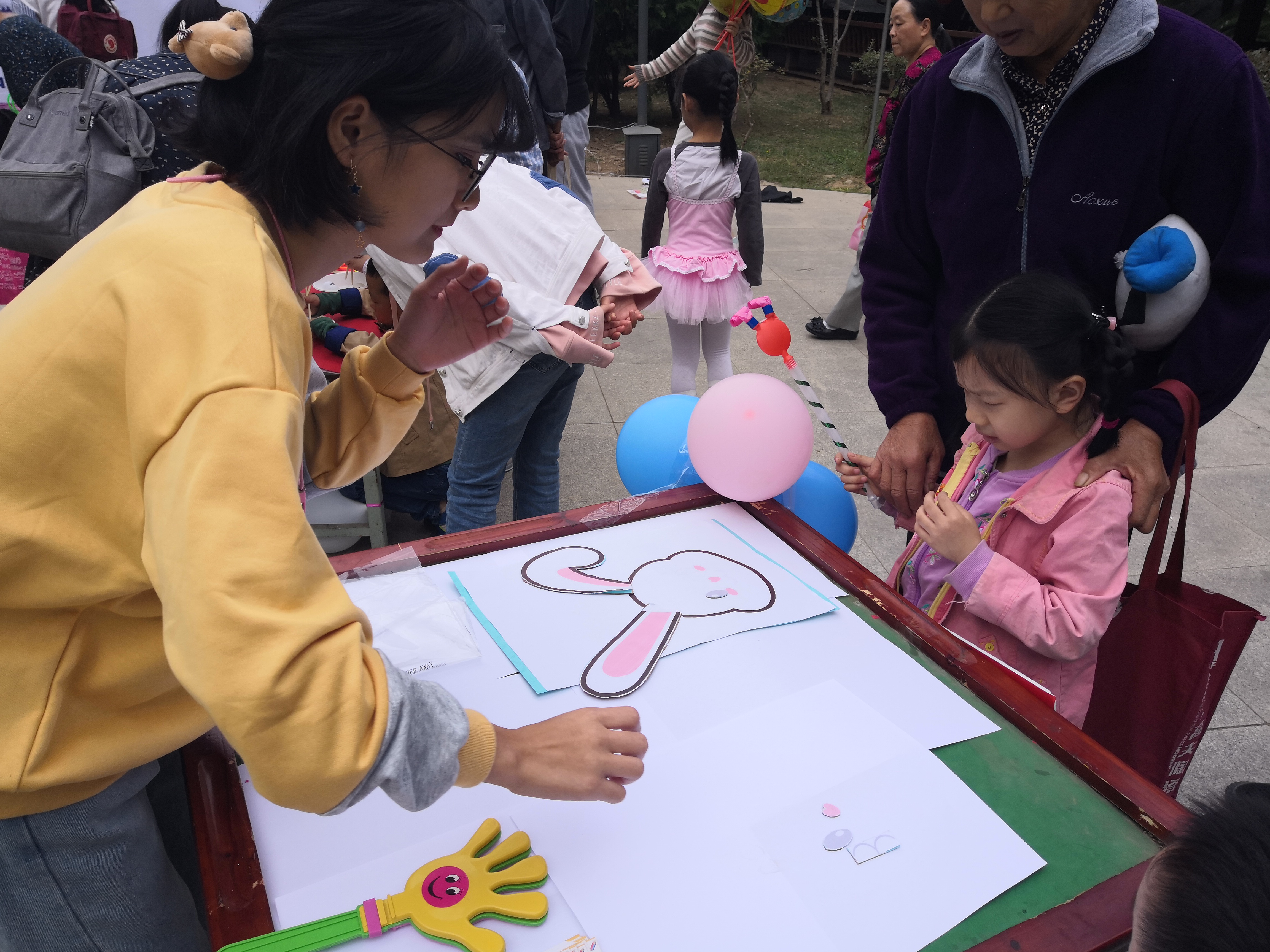 上午九点,游园会在小朋友们欢乐的笑声中正式拉开帷幕。活动以开小火车的形式进行,每辆火车由一位志愿者作为小火车司机,带着两位小朋友,模拟投币环节参加活动。活动现场,“小火车开动啦!”、“到站啦!”以及小朋友成功的欢笑声此起彼伏,一辆辆小火车成功通关来到终点站兑奖区。在“森林小画室”的游戏当中,两位小朋友为一组,其中一位负责蒙着眼睛根据指示将放在准备好的“鼻子”、“眼睛”和“耳朵”放在准备好的“脸”上,另一位小朋友进行指示。其中一次活动中,一位小朋友将“耳朵”拿反了,而指导活动的孩子一直不知道如何表述这样的情况,而在志愿者的引导下完成了“脸”之后,两个小朋友开心的拥抱在了一起。