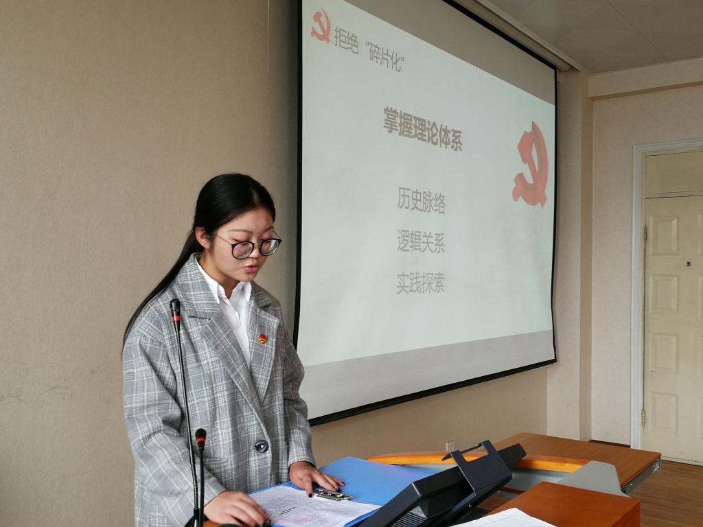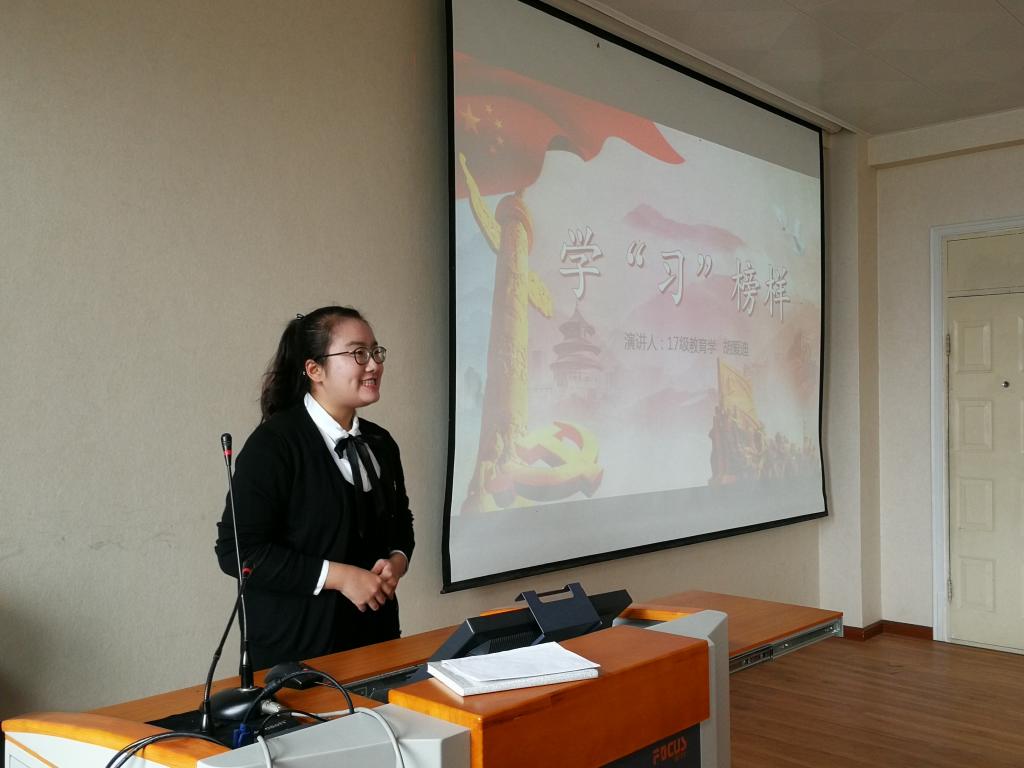 在何景宁介绍了四位嘉宾、大众评审和参赛选手,宣布了评分细则后,活动正式开始。第一部分是参赛选手的演讲。首先是教育学院18级的李轩,她认为“理论学‘习’不能浅尝辄止”,并针对大学生理论学习“碎片化”“浅表化”“标签化”的问题提出了几点建议。紧接着,17级的参赛选手胡爱迪在演讲中以习近平主席的多个小故事引入,提倡我们“学‘习’榜样”,讲述动情,引人回味。第三位宣讲的是17级的肖子莲同学,她通过最近关于“学生组织内部官僚主义”这一热点事件,倡导“要做青年友,而不是学生官”。其后,18级的经湛进行了“从旧日星火到今朝梦想”的演讲,着重强调了习近平总书记在中华全国青年联合会的十六字诀;17级选手黄四启生动有情地描述了自己在暑假支教的经历,号召当代大学生要“不弛于空想,不骛于虚声”。最后演讲的是18级选手俞文霞,她在演讲中提到:“青年的价值取向决定了未来社会的价值取向,只有我们树立正确的世界观、人生观、价值观,才能让我们的人生拥有正确的航向。”
