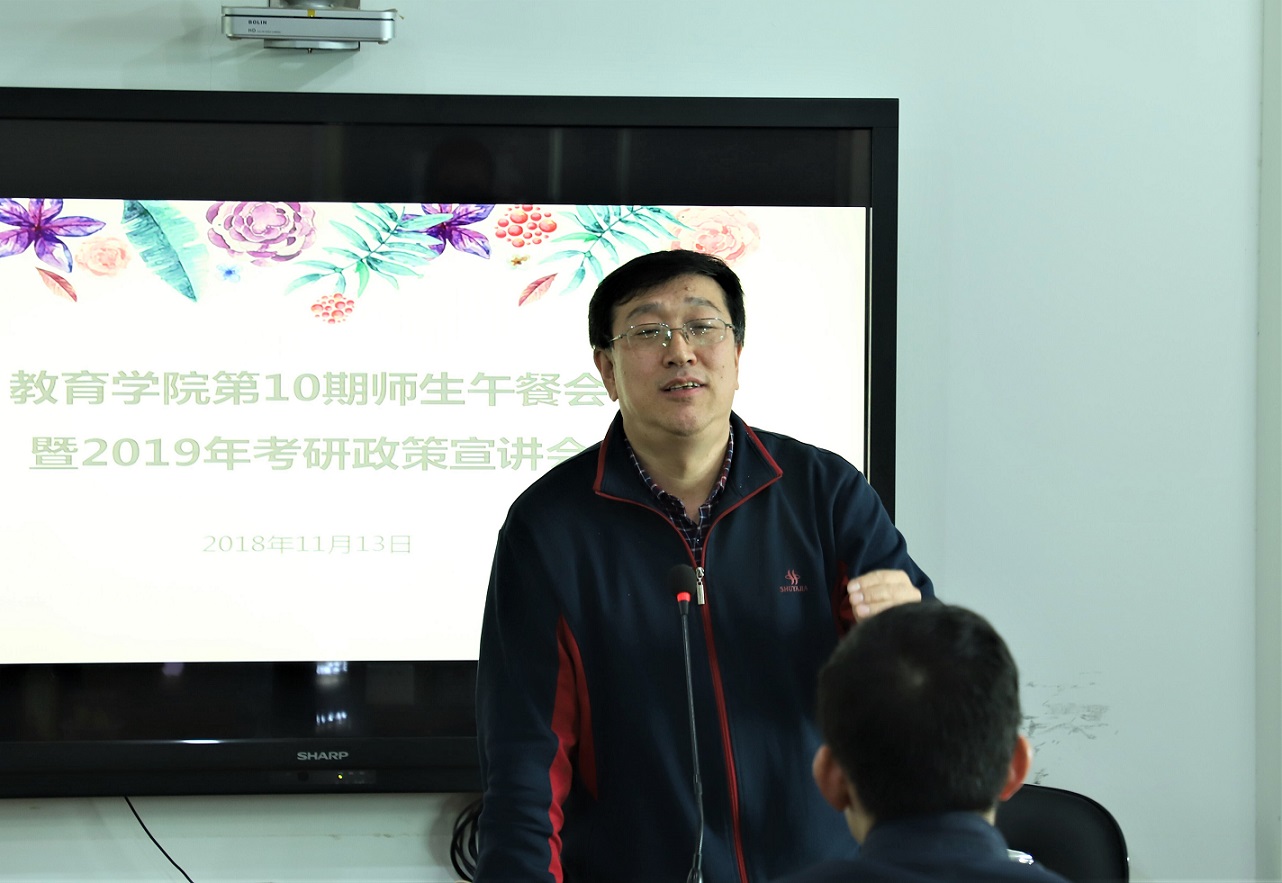 教育学院宣传中心讯(记者:郭子轩 郑怡岑 摄影:张钰久 编辑:张萌)11月13日中午,我院第10期师生午餐会暨2019年考研政策宣讲会于田家炳楼601会议室顺利举行。我院科研副院长申国昌、院分党委副书记李静、研究生专业导师组组长岳伟、罗祖兵、李先军、唐斌、戴伟芬、孙玉梅、张莉、邹义欢等8位老师出席本次宣讲会。此次会议由院团委书记王倩倩主持。