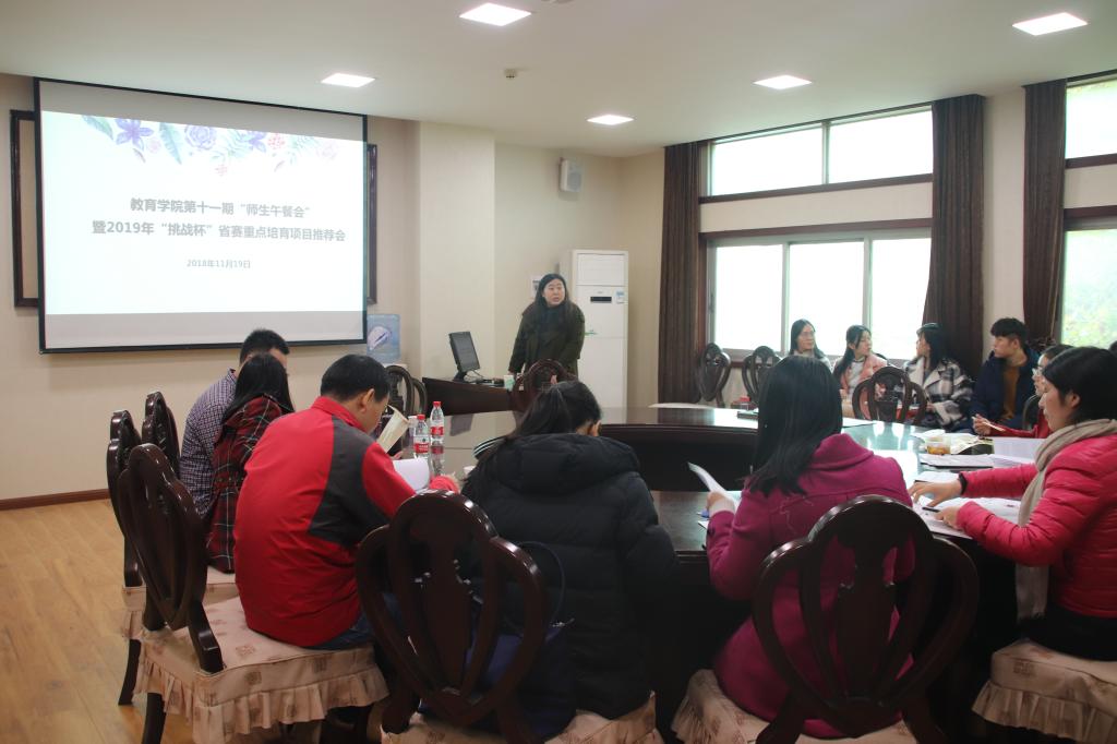 教育学院宣传中心讯(记者 摄影:李露 编辑:张萌)11月19日中午,教育学院第十一期师生午餐会暨“挑战杯”推进活动于田家炳楼403教室顺利举行。本次推进会重点在于进一步推动我院各参赛作品进展,修正研究方向、指导研究方法、打磨研究细节。此次会议由我院团委书记王倩倩主持,我院分党委副书记李静、雷江华教授、高巍副教授、龚欣副教授、朱楠老师、谭颖芳老师、叶庆娜老师等担任评委。我院本科生朱涵、郑怡岑和林晨等带领各自项目团队参与此次推进会。