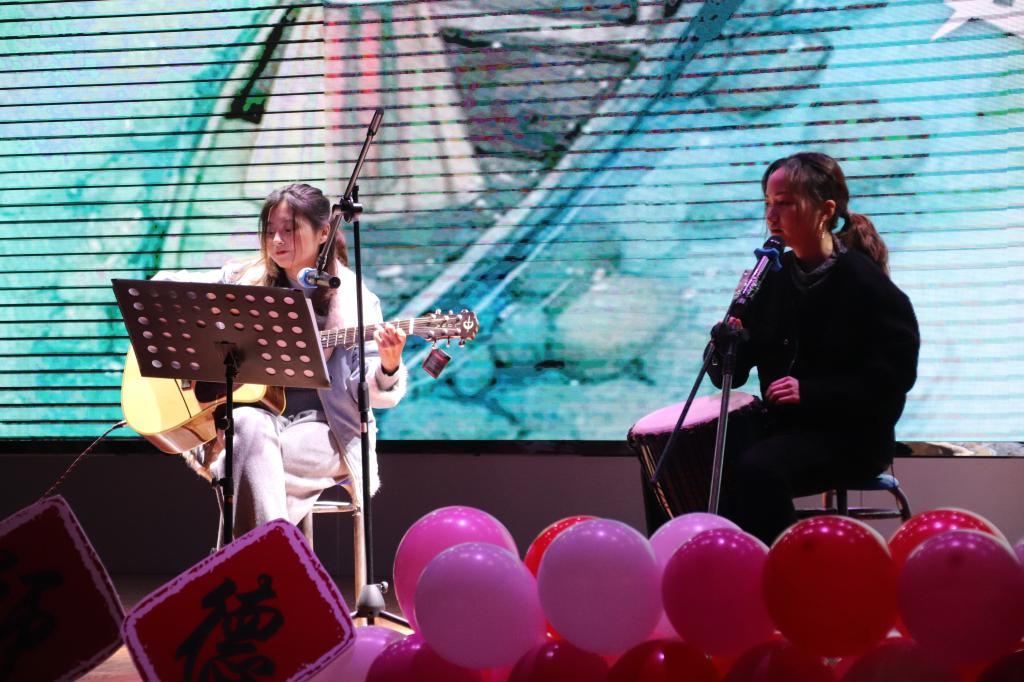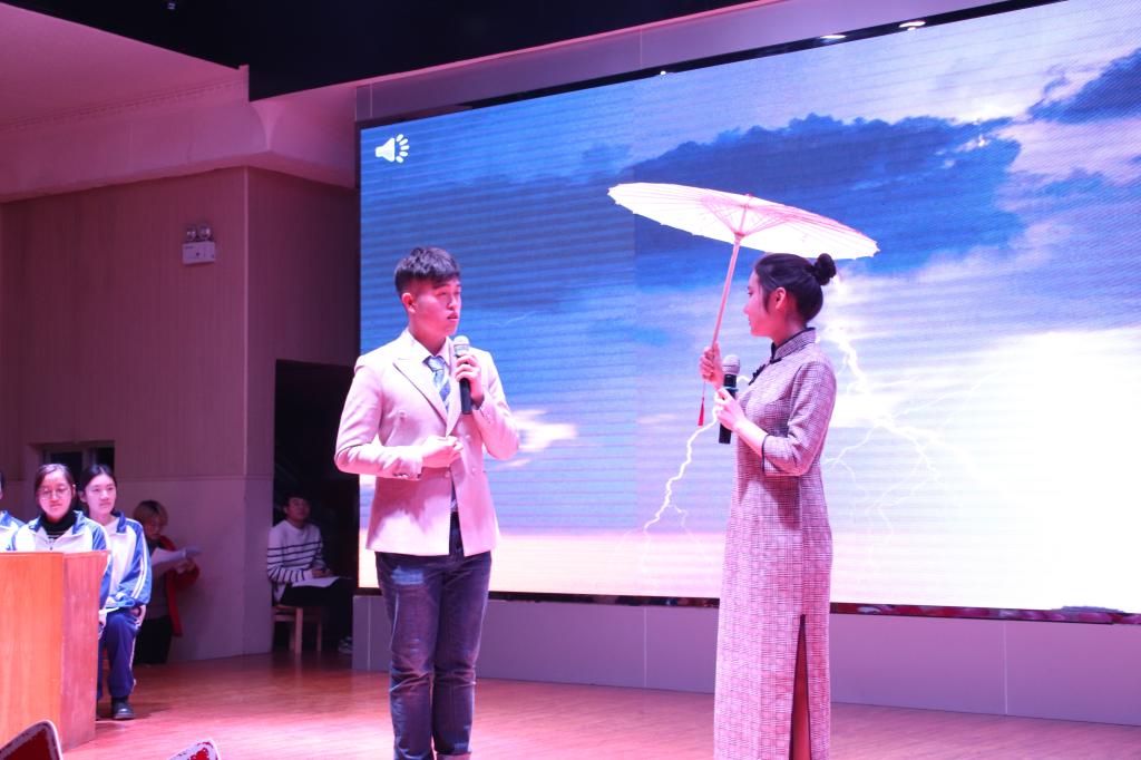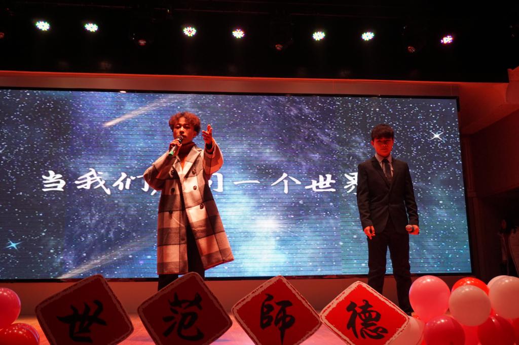 诗歌常与音乐为伴,由王建梁老师与1803班学生带来的歌曲朗诵《水调歌头》为经典旋律重填华美词章,唱响不朽师魂。同样献上优美歌声的还有我院研究生带来的歌曲《走马》以及超级新声优秀选手田嘉崇、向星宇演唱的《当我们在同一个世界》,音乐学院学子专业水准的高亢美音将现场气氛推向高潮。1801班学生朗诵的《最后一课》带观众领略了师德的风采,1702班倾情演绎的情景剧《我穿越了》展现了一段超时空的教育对谈。