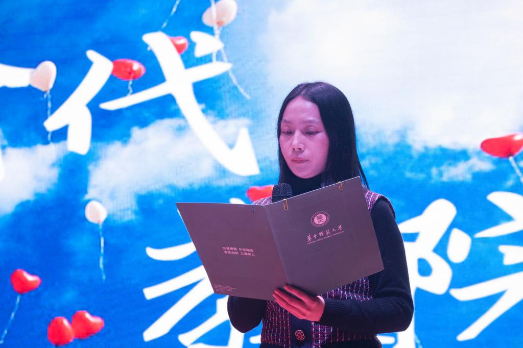 忠诚、博雅、朴实、刚毅,一直都是教院人恒久高唱的主旋律,在华师精神的引领下,在过去的九十五载岁月中,教院人坚信天道酬勤、坚持同舟共济,以青丝白发悦育家国栋梁,新时代有新机遇、更有新挑战,追寻先辈足迹、传递教育薪火的新时代教院人,必将在教育路上共赴新征程、同书新篇章。李玲、雷万鹏、李静和申国昌代表我院领导班子诵读的《新时代教院人》,擂响我院2019年上下求索的第一声战鼓。其后,研究生代表朗诵的《改革开放四十周年赋》,为新时代献上赞歌。我院2018级博士生党支部带来的朗诵《闪耀吧!青春的火光》闪亮登场,勉励教院学子用敢为人先的豪情与魄力面对新的机遇与挑战,为本次新年诗歌朗诵会画上了圆满的句点。