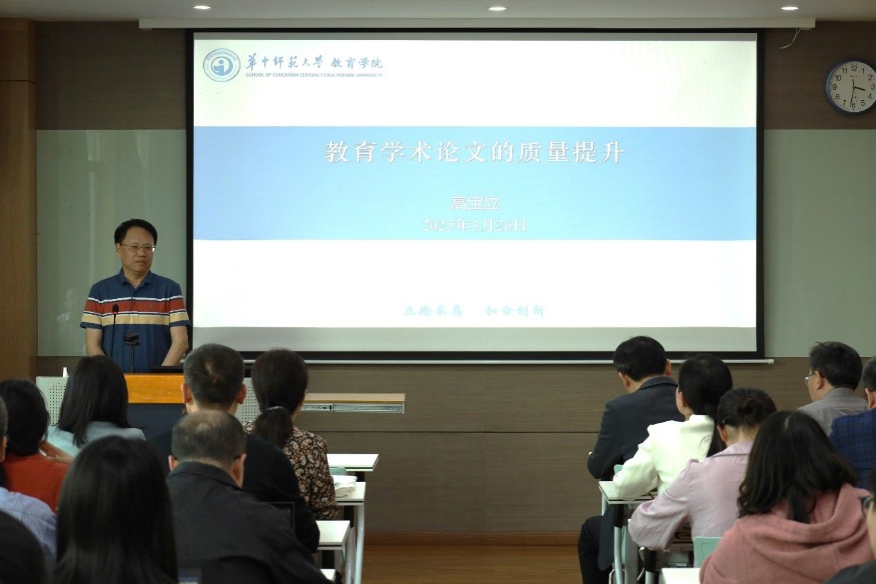 教育学院融媒体中心讯(通讯员 詹思迪)2025年3月26日下午,教育学院“学在田楼”166期学术讲座在田家炳教育书院905报告厅举行。本次讲座主题为“教育学术论文的质量提升”,由中国教育科学研究院原副院长、《教育研究》杂志原总编高宝立教授主讲。讲座由教育学院院长雷江华主持,学院教师及学生代表参加了此次讲座。
