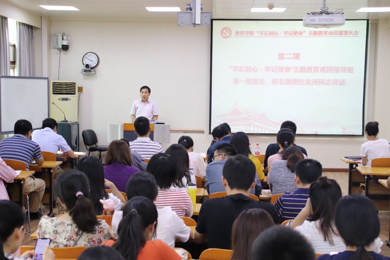 教育学院宣传中心(记者 王诗薇 卢宇峥 编辑 张萌)9月25日下午,教育学院党委“不忘初心、牢记使命”主题教育动员部署大会在田家炳502教室举行。学校“不忘初心、牢记使命”主题教育巡回指导组第一组组长、校长助理任友洲,第一组副组长、校办副主任罗高峰莅临指导。我院领导班子、教工党员、学生党支部书记及学生党员代表参加大会。本次会议由教育学院院长兼党委副书记雷万鹏教授主持。