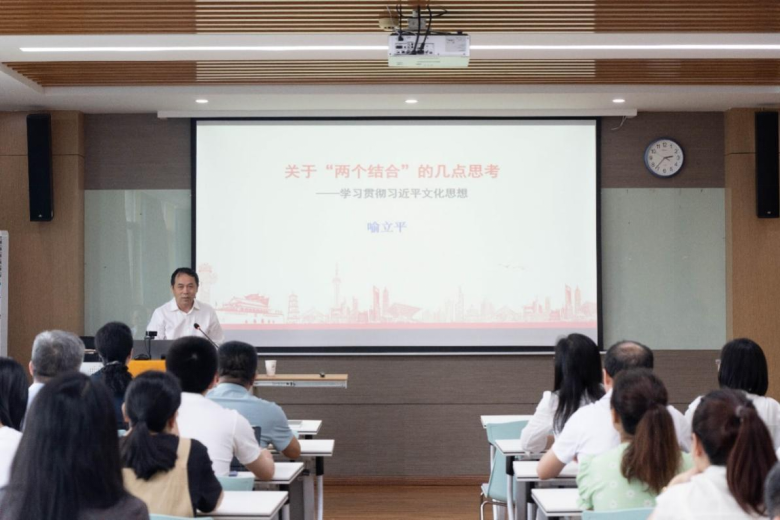 教育学院融媒体中心讯(通讯员 刘馨雨 詹思迪)5月31日,我院党委理论学习中心组集体(扩大)学习暨教职工理论学习会在田家炳楼905学术报告厅举行。省人大常委会委员、省人大教科文卫委员会副主任、湖北省炎黄文化研究会会长,省社会科学界联合会原党组书记喻立平以《关于“两个结合”的几点思考——学习贯彻习近平文化思想》为题作专题报告。学院党政领导班子、党委委员、全体教职工参会,报告由院党委书记陈雪玲主持。