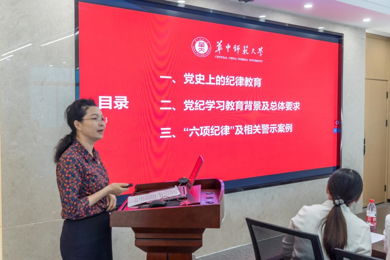 教育学院融媒体中心讯(通讯员 王思琪 刘馨雨)6月28日下午,教育学院党委书记陈雪玲以“党史上的纪律教育”为题讲授党纪学习教育专题党课,华中师范大学发展规划处党支部、教育学院教工第一党支部全体党员参加。