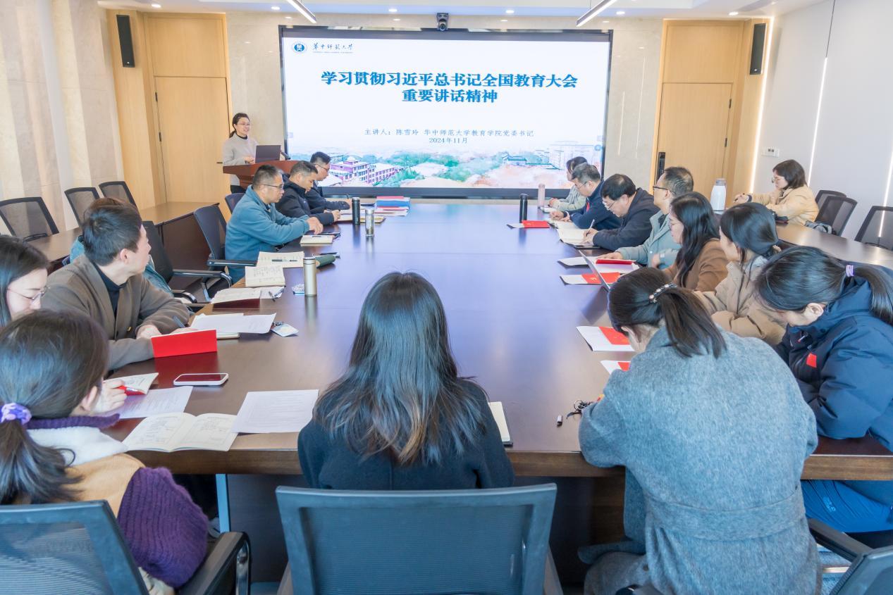 教育学院融媒体中心讯(通讯员 刘馨雨)2024年11月27日下午,教育学院党委书记陈雪玲以“学习贯彻习近平总书记在全国教育大会上的重要讲话精神”为题讲授专题党课。教工第二党支部全体党员、入党积极分子教师代表等参会交流,会议由教工第二党支部副书记刘来兵主持。