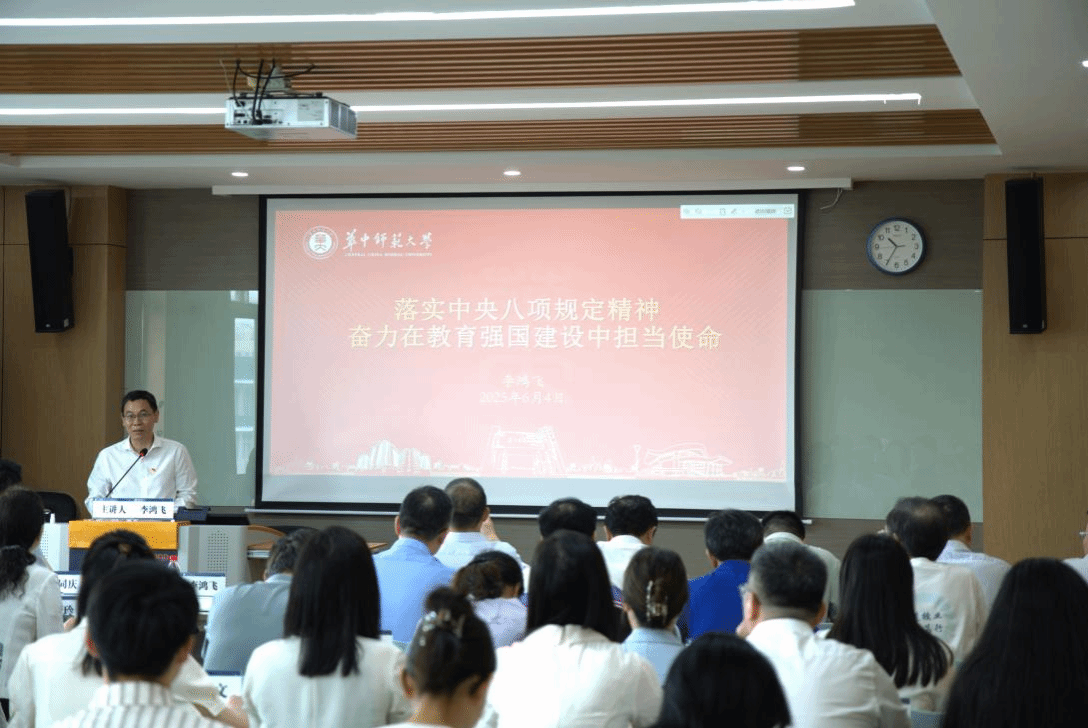 教育学院融媒体中心讯(通讯员 黄锐蕊 刘馨雨 周佳瑶 刘琰)6月4日上午,华中师范大学党委常委、副校长李鸿飞以《落实中央八项规定精神,奋力在教育强国建设中担当使命》为题讲授专题党课。学校发展规划处、财务处、国有资产管理处、信息化办公室、图书馆(博物馆)、档案馆(校史馆)、校医院、资产经营管理有限公司、社会学院、新闻传播学院和教育学院等单位领导班子成员、师生党员代表参加。