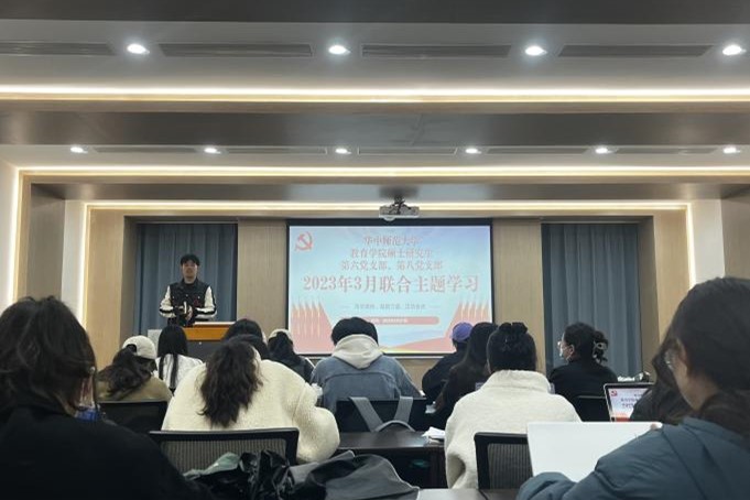 教育学院硕士研究生第六党支部和第八党支部在田家炳601教室联合开展3月份主题党日活动,会议由岳浩文同志主持。首先,李子婵同志带领全体党员共同学习了“学思恽代英、践行新使命”主题党课,从“恽代英生平事迹”、“恽代英的青年观”、“恽代英青年观的当代启示”三个方面全面介绍了恽代英同志。随后,岳浩文同志带领全体成员围绕“恽代英精神”、“全国两会精神”和“党员不信教”三个内容进行了深刻讨论。高菀彤同志谈到,虽然历史已经过去,但我们不能忘却,青年人要缅怀先烈事迹,敬仰先烈品格,学习先烈精神。