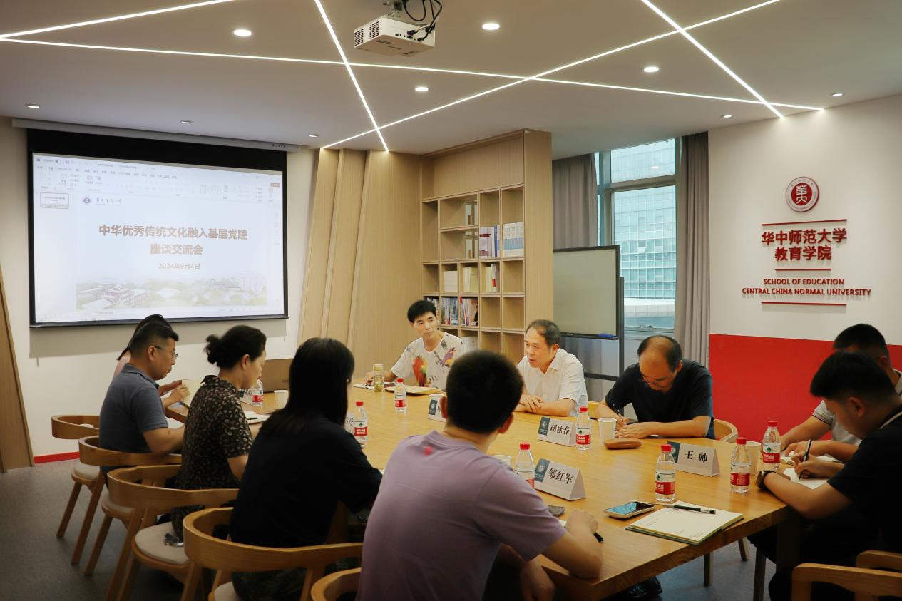 教育学院融媒体中心讯(通讯员 刘馨雨 胡力扬)2024年9月4日下午,中华优秀传统文化融入基层党建座谈交流会在田家炳教育书院415会议室顺利召开。湖北省炎黄文化研究会会长、省人大常委会委员、省人大教科文卫委员会副主任喻立平,湖北省炎黄文化研究会秘书长、省委讲师团一级调研员胡秋春,教育学院党委书记陈雪玲、党委副书记苏春艳、王璐,副院长郑刚及教师王帅、姚林群、邹红军等参加座谈会,会议由陈雪玲主持。