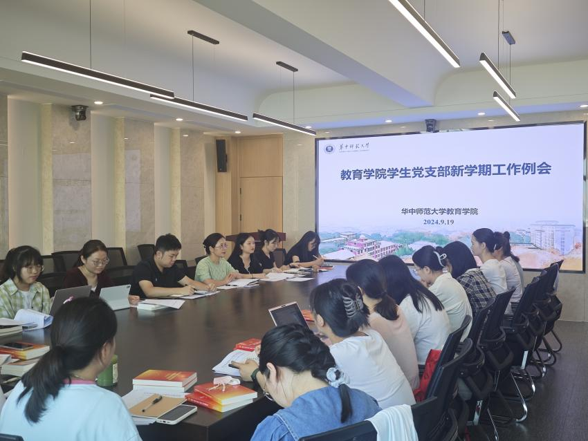 教育学院融媒体中心讯(通讯员 吴宇琳 胡力扬 刘馨雨)9月19日,华中师范大学教育学院学生党支部新学期工作例会在田家炳教育书院901会议室召开。教育学院党委副书记苏春艳,党务干事刘馨雨,党务助理胡力扬及教育学院各学生党支部书记参与会议,会议由刘馨雨主持。