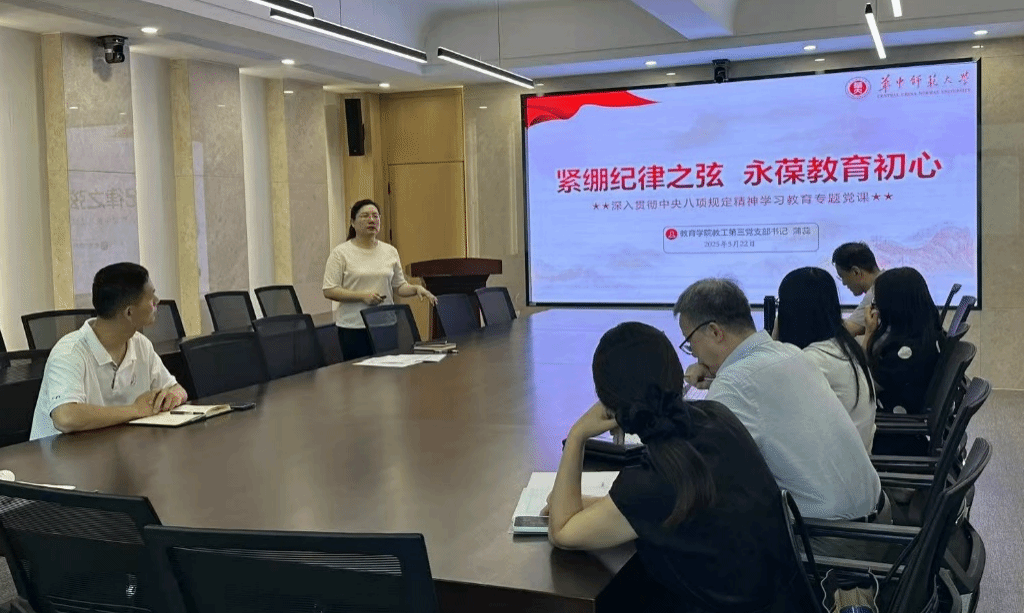 教育学院融媒体中心讯(通讯员 邹义欢)5月22日,教育学院教工第三党支部在田家炳901会议室开展了学习贯彻中央八项规定精神的主题党日活动。学习活动以专题党课的形式开展,第三支部书记蒲蕊同志为全体党员讲授了题为“紧绷纪律之弦,永葆教育初心”的专题党课。