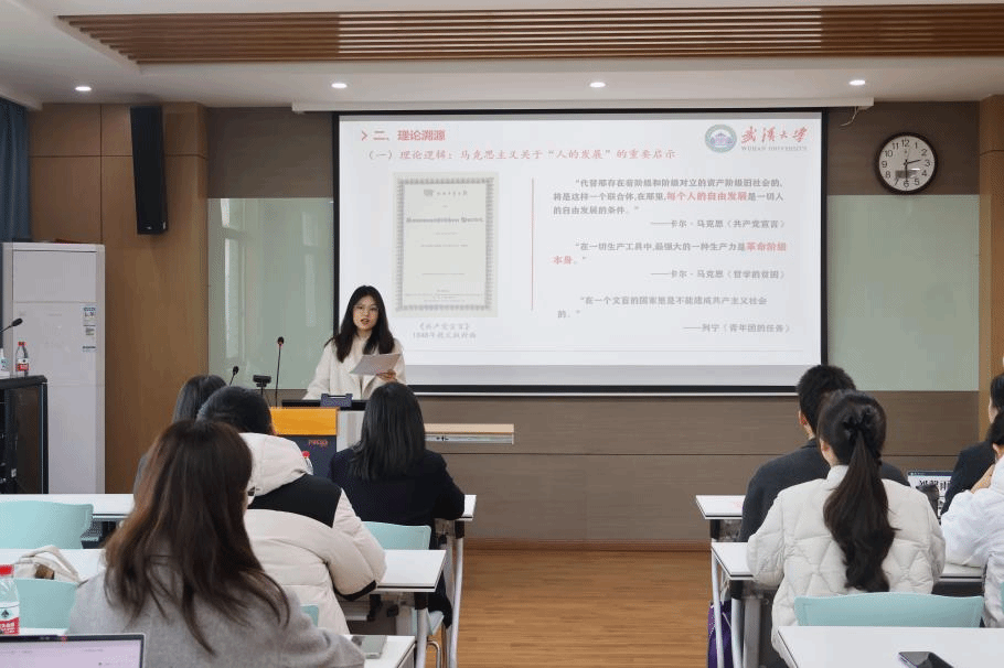在党的二十届四中全会精神专题学习环节,华中师范大学教育学院硕士研究生第一党支部党员代表彭雨茜以“锚定强国目标,激扬青春力量——深入学习贯彻党的二十届四中全会及习近平总书记南下考察重要讲话精神”为题开展领学,她通过数字化解读的方式带领全体师生领会党的二十届四中全会精神的核心要义,并深入解读了大会中的教育思想。她号召青年党员以“咬定青山不放松”的韧劲和“敢教日月换新天”的闯劲,以扎实的专业素养和昂扬的奋斗姿态,投身教育强国建设的伟大实践。武汉大学马克思主义学院硕士2025级第四党支部党员代表黄湘从两院专业共性出发,结合马克思主义理论知识,开展题为“以‘投资于人’,激活青春动能”的领学。她从“投资于人”的理论知识,分析了青年党员时代责任于使命,呼吁广大青年党员要挺膺担当,让青春在全面现代化的赛道上加速赛跑。