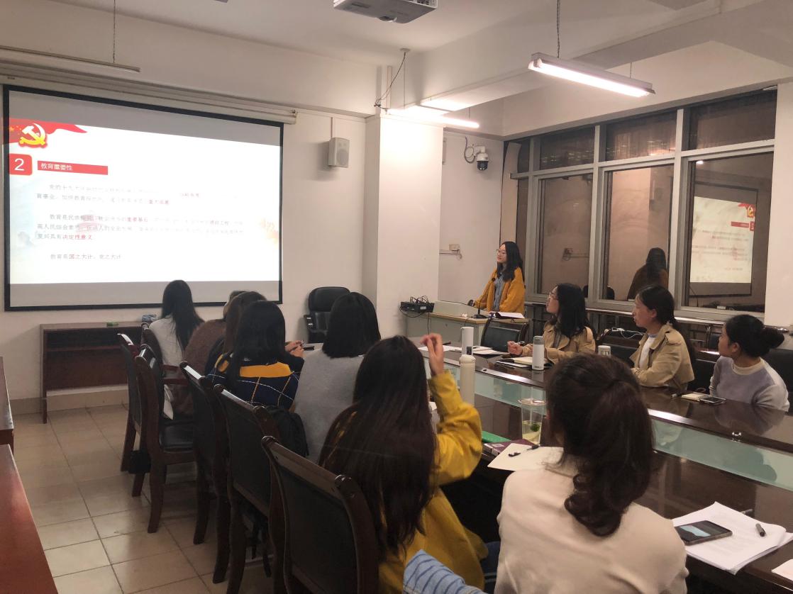 本次会议围绕“习近平总书记在2018年全国教育大会重要讲话”和“习近平总书记关于扫黑除恶工作重要指示精神”两个主题展开。在正式主题学习活动开始前首先由支部书记郭柯然带领全体党员重温入党誓词、诵读党章;组织委员余珍向全体党员宣读《中国共产党章程》之第七章——党的纪律。