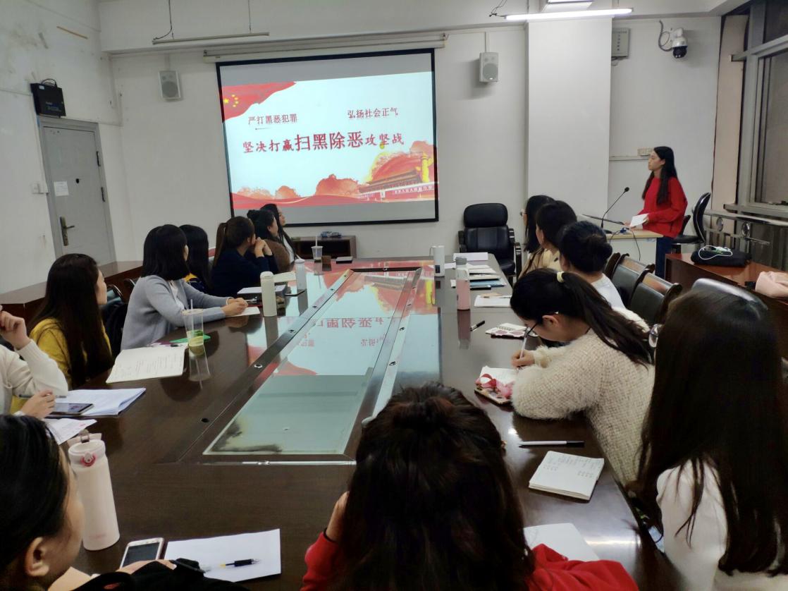 其次宣传委员刘依婷以“坚决打赢扫黑除恶攻坚战”为主题,带领大家共同学习习近平总书记关于扫黑除恶工作重要指示精神。主要介绍了扫黑除恶的重大意义、内容,其次指出重点打击的十二种黑恶势力,最后对“扫黑除恶”进行深度解读,全体党员认真学习并参与交流讨论。