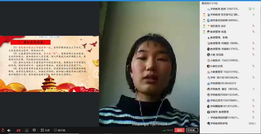 活动中,同学们共同分享了防疫期间的工作生活经历和感悟体会,同学们围绕自己在疫情防控期间的学业生活情况、志愿辅导情况等进行了交流。