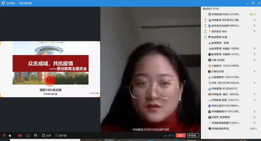 教育学院宣传中心讯(通讯员 刘依婷 编辑 张萌)3月23日下午15:00,我院硕研1803党支部通过腾讯视频开展了主题党日及“研究生线上点名”活动。此次会议由硕研1803党支部书记郭柯然主持。会议应到21人,线上签到 20人,请假一人,符合支部大会召开条件。