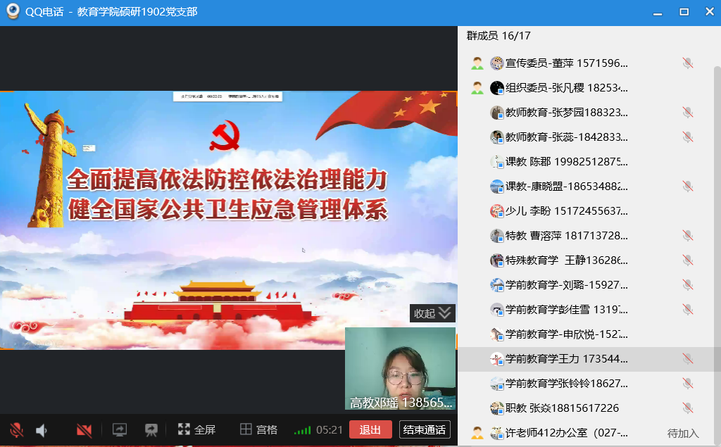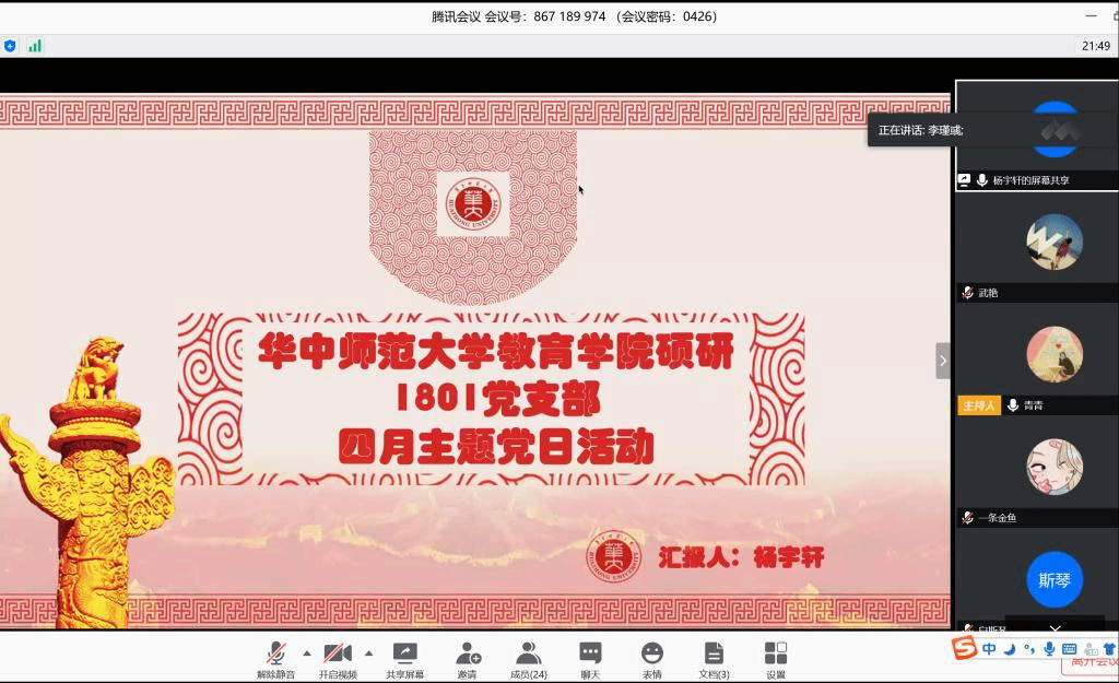 硕研1801党支部采取腾讯会议的在线形式开展学习活动。会议由支部宣传委员李瑾彧主持,第一党小组代表杨宇轩、杨世英和廖星铭三位同志带领大家进行学习。首先杨宇轩为大家讲解了“习近平主持召开中央全面深化改革委员会第十二次会议强调完善重大疫情防控体制机制,健全国家公共卫生应急管理体系,把生物安全纳入国家安全体系”、“党委(党组)落实全面从严治党主体责任规定”两方面内容。接着,杨世英带领大家一起学习《习近平新时代中国特色社会主义思想三十讲》(第二十三讲:坚持总体国家安全观)以及新时代爱国主义教育实施纲要。随后,廖星铭围绕深入学习贯彻习近平总书记关于统筹抓好疫情防控和经济社会发展的重要讲话为大家进行讲解。张莉群在学习后谈到学院本科生辅导员张萌在武汉爆发疫情后,果断退掉返乡车票,主动向党组织请战,坚守在防疫一线,从实际行动中体现新时代党员的责任与担当,这种精神值得每一位党员同志学习。