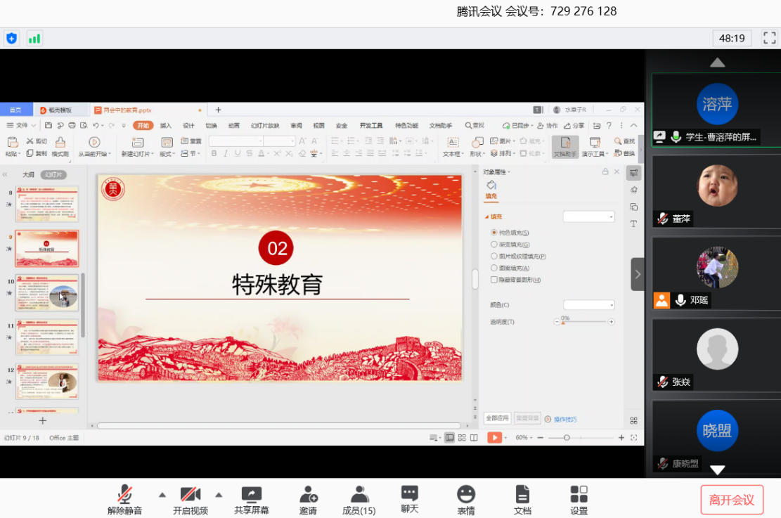 教工第一党支部李玲同志讲到,《政府工作报告》站在新的历史起点,高屋建瓴,从战略高度指明了我国教育事业的发展方向和根本遵循。在推动教育公平发展和质量提升方面,学院将以“融合教育研究院”为突破口,以教育平台、职训平台、智库平台和融合教育资源平台,致力“办好特殊教育”,倡导教育者扎根本土,用脚步丈量中国乡村学校,发出华师声音,留下华师印记。在推进“双一流建设”方面,学院将根据国家战略发展规划,发挥原有的优势学科,补足短板,寻求新的学科增长点,以融合教育理论研究与实践、王亚南教育思想研究,推动特殊教育学、高等教育学及教育经济与管理的跨越式提升。教工第一党支部白颖颖同志从两个方面明确了作为一名共产党员和高校教师的使命和责任。作为一名新进专业教师,要高效、负责地开展本科生和研究生的线上教学和日常指导工作;作为一名兼职研究生辅导员,要时刻关注各年级博士生的学习和生活、思想动态,记录每日健康状况统计报备和心理健康状况,做到随时沟通、即时联络。
