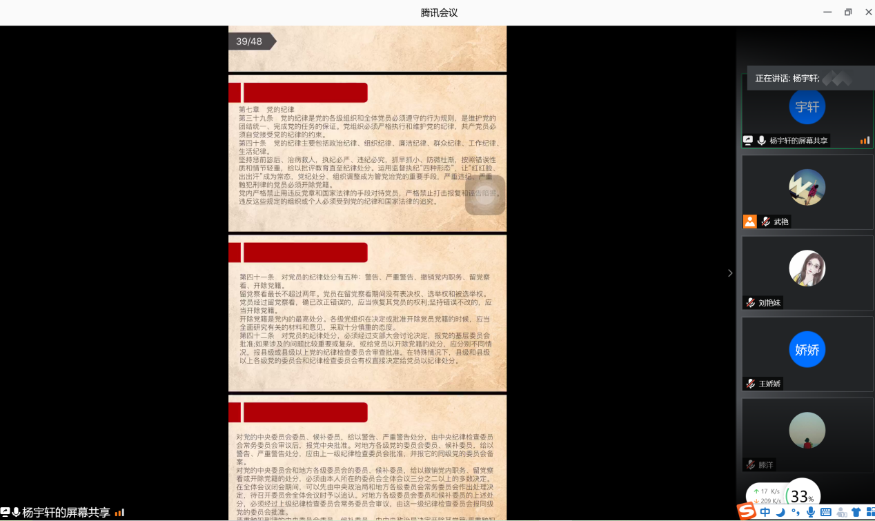 1801硕研党支部范青青同志在总结本次主题党日活动时表示,支部成员邓兰“做逆行者中的守护者”,高爱平“平凡中见证伟大”,吴晗“生是师的师”,邱岚珍“寒冬已然过去,美好如约而至”,杨世英“走吧,走到未来城里去”的助学事迹,都展现了学生党员对教育事业的关怀,诠释了党员同志艰苦奋斗、迎难而上的担当,并希望支部成员在今后的学习和生活中能够贯彻敢于担当、艰苦奋斗、默默奉献的伟大精神,向身边优秀党员同志学习,在为人民服务的征途中提升自我,利用所学所思所为全力以赴地帮助他人。