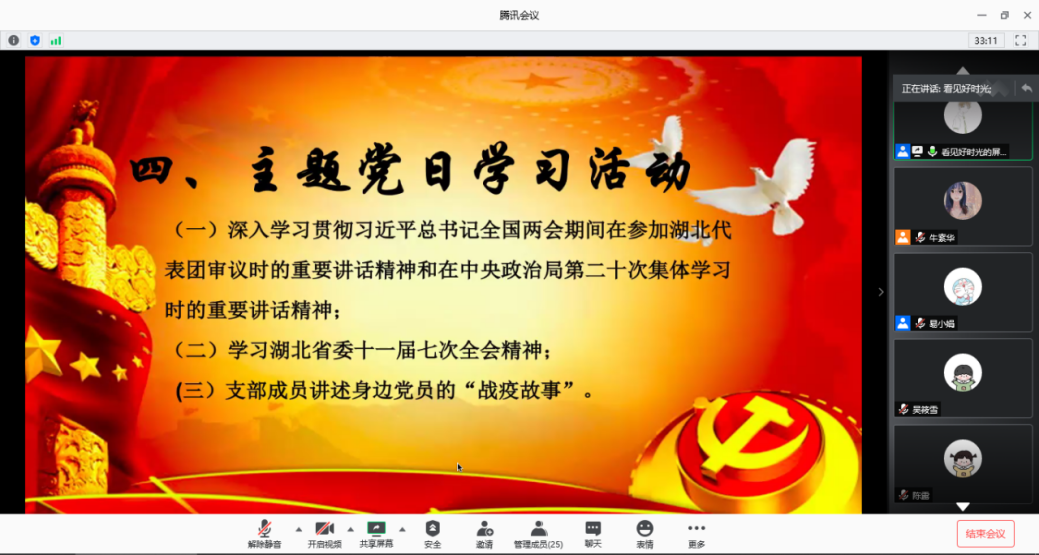 教育学院宣传中心讯(通讯员 华薇 卢宇峥 编辑 张莉)根据学校组织部的安排,教育学院分党委筹备并开展了6月份主题党日活动。学习内容主要包括习近平总书记全国两会期间在参加湖北代表团审议时的重要讲话精神和在中央政治局第二十次集体学习时的重要讲话精神、湖北省委十一届七次全会精神,同时,学习支部成员讲述的身边党员闻令而动、向险而行、“有危险我先上”、 “下社区助一线”、“舍小家为大家”的生动故事。