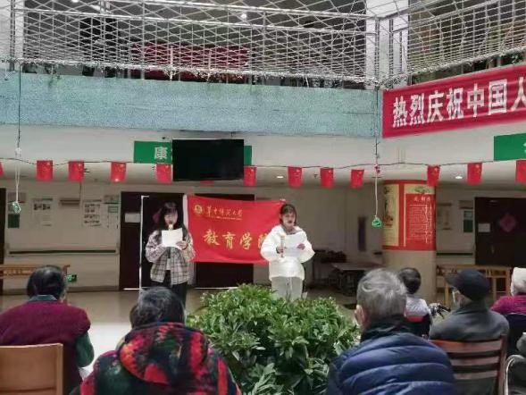 表演结束后,志愿者们将教育学院的纪念礼品赠送给现场的老人及工作人员作为留念。此外,各位志愿者就养老敬老相关的社会问题展开了讨论:中国正在迈入老龄化社会,如何实现老有所依?如何给予老人足够的陪伴?如何帮助老人摆脱孤独。最后,大家一致同意,作为青年党员/积极分子,应起好带头作用,提高自身的社会责任感和敬老爱老意识,肩负起历史将带来的新使命,不断传承尊老、爱老、敬老和助老的中华民族传统美德。
