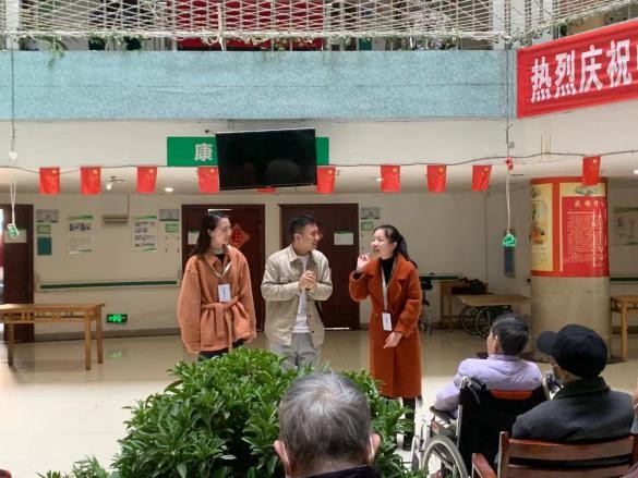 活动当天,志愿者们围坐在老人们身边,与老人们闲话家常,倾听他们的心声,并送去了温暖的祝福。志愿者们还发挥特长,为老人们进行了文艺表演。活动中,《国家》手语操展现了家国情怀;动感广场舞《最亲的人》,律动的节拍点燃了现场气氛;诗朗诵《为你读诗》展现了海子的温柔浪漫;歌曲《最美的太阳》向老人们展现出年青一代的活力与朝气;相声《曲苑杂坛》说学逗唱引得老人们开怀大笑。